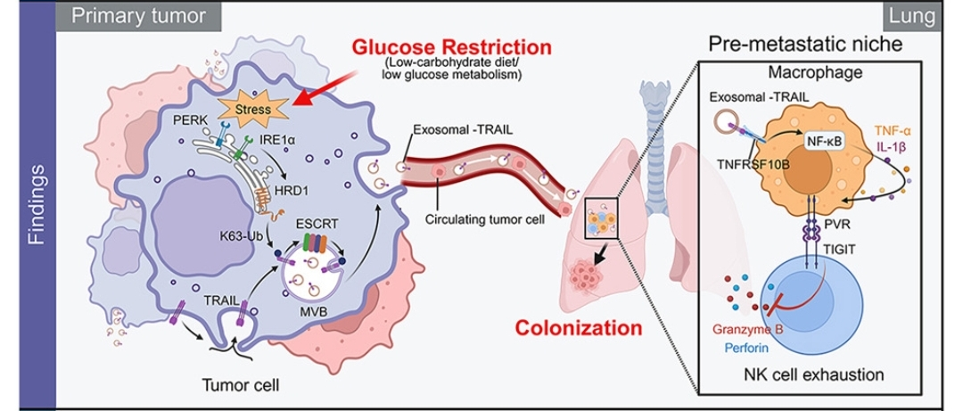 具体文献见:Wu CY, Huang CX, Lao XM, Zhou ZW, Jian JH, Li ZX, Wu YY, Liu ZY, Chen L, Liu L, Zheng L, Wei Y, Kuang DM. Glucose restriction shapes pre-metastatic innate immune landscapes in the lung through exosomal TRAIL. Cell. 2025 Jul 8:S0092-8674(25)00728-7. doi: 10.1016/j.cell.2025.06.027.